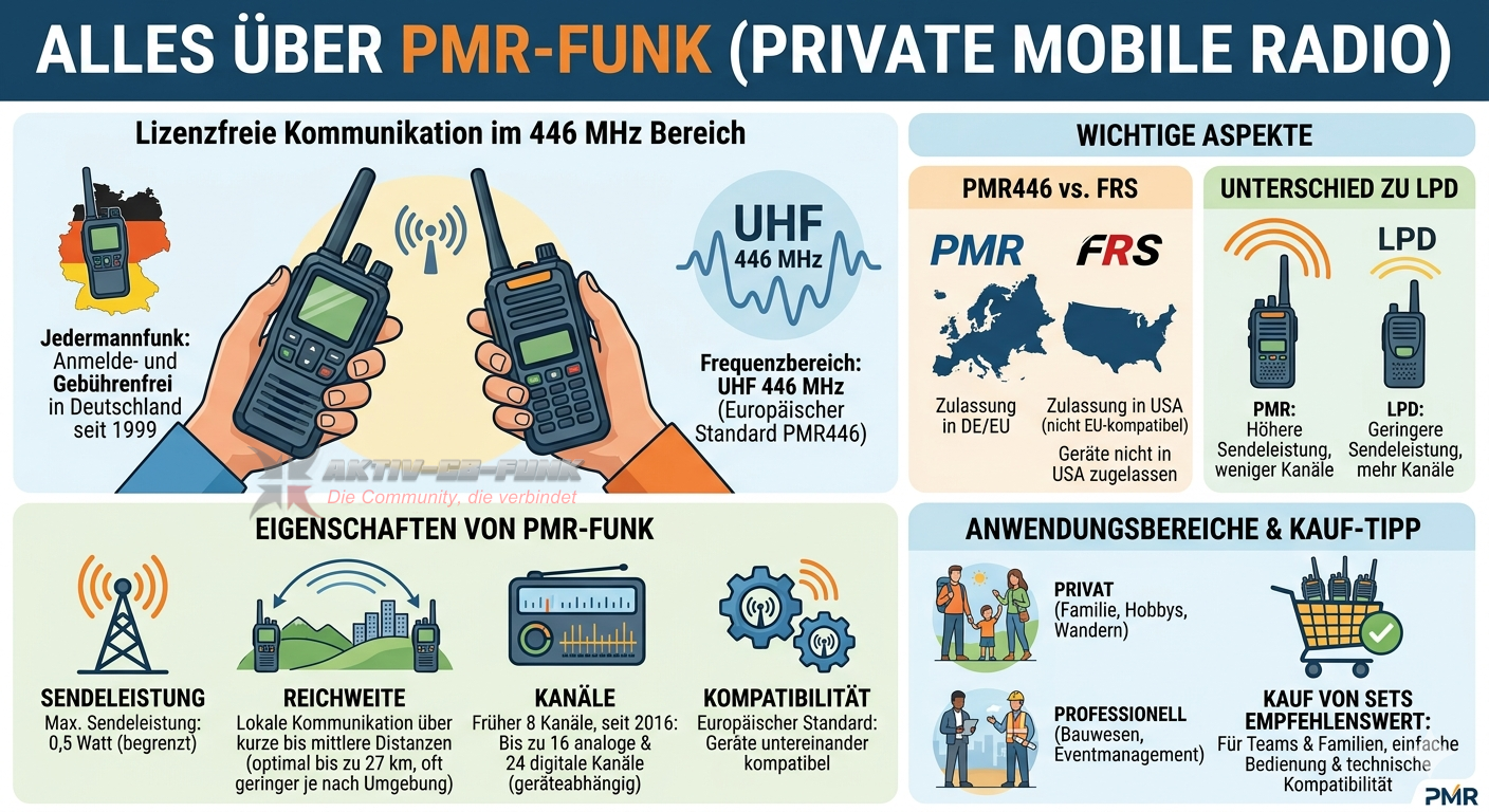 Im PMR Bereich sind ebenfalls nur Geräte mit fest angeschlossener Antenne zugelassen mit einer max. Sendeleistung von 0.5 Watt. Die Wellenlänge im PMR Bereich bei 446 Mhz beträgt 70 cm. Auch im PMR Bereich bei 446 Mhz ist der Sendebetrieb mit erweiterten Amateurfunkgeräten nicht erlaubt.